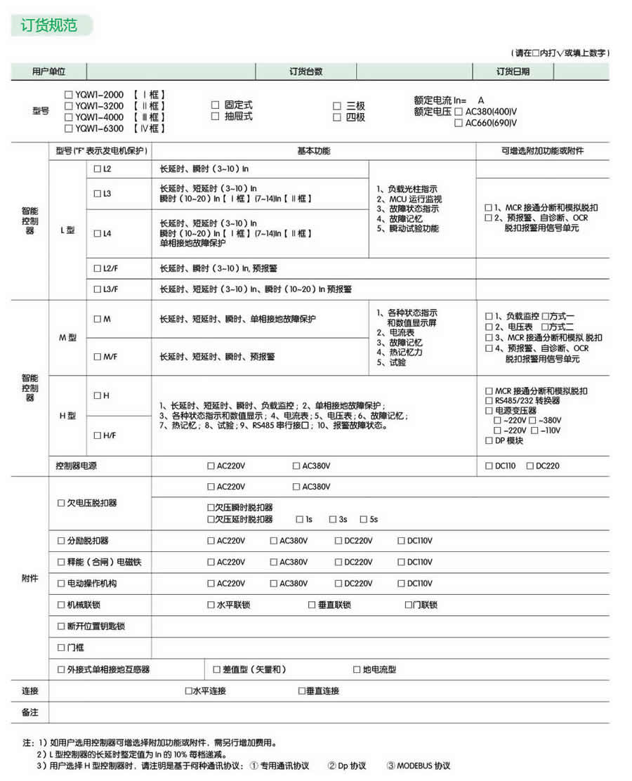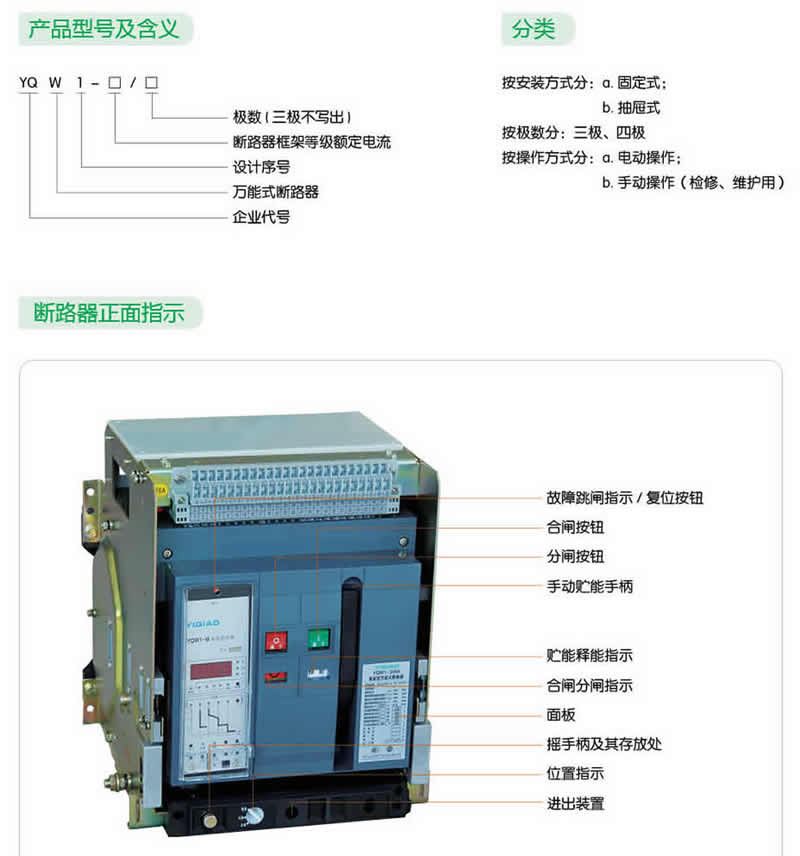 ● YQW1 系列智能型萬(wàn)能式斷路器用于控制和保護(hù)低壓配電網(wǎng)絡(luò),一般安裝在低壓配電柜中作主開(kāi)關(guān)起總保護(hù)作用。