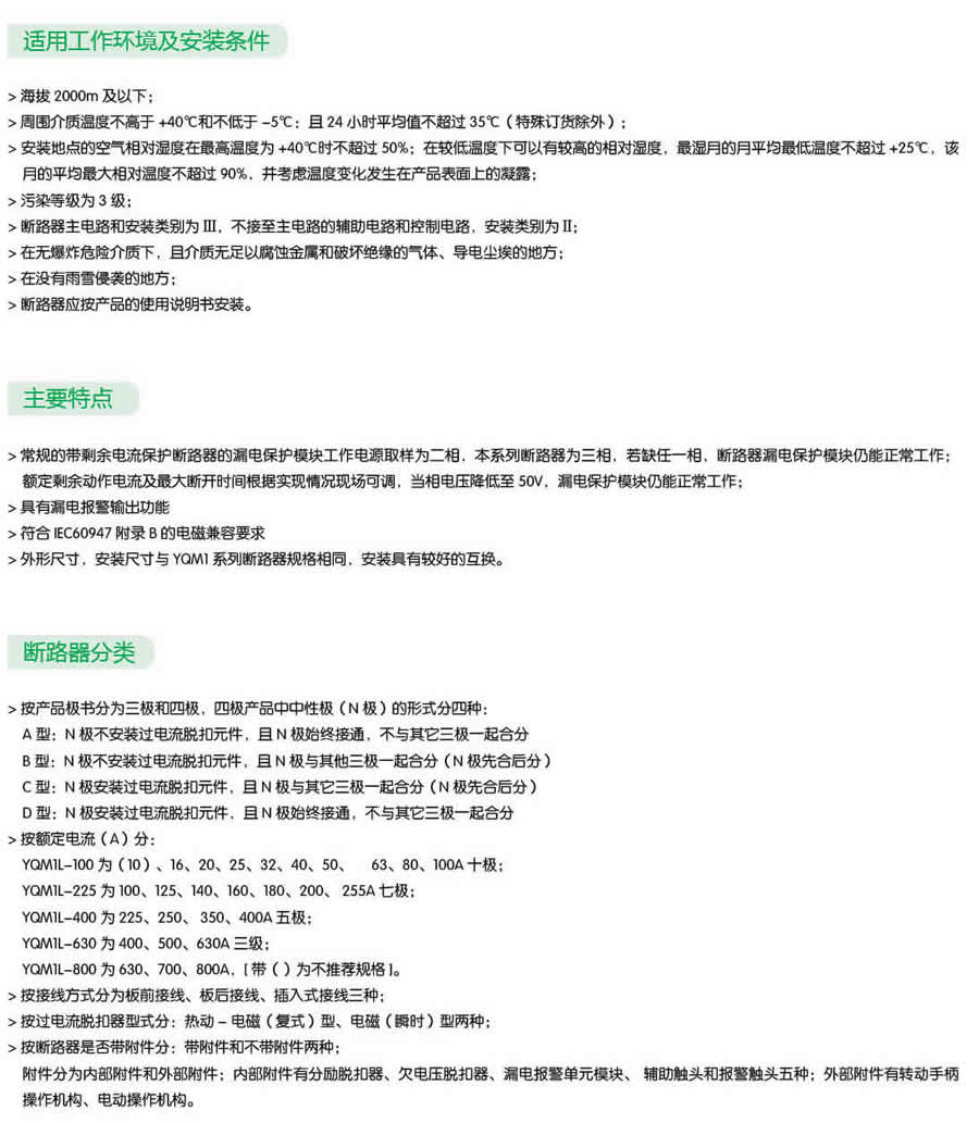 YQM1L 系列帶剩余電流保護(hù)塑料外殼式斷路器(以下簡(jiǎn)稱斷路器),是我司采用國(guó)際先進(jìn)設(shè)計(jì)、制造設(shè)計(jì)研制、開發(fā)的新型斷路器之一。其額定絕緣電壓為800V,適用于交流50Hz, 額定工作電流至800A 的電路中作不頻繁轉(zhuǎn)換及電動(dòng)機(jī)不頻繁起動(dòng)之用。